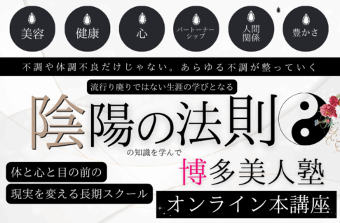 博多美人塾では、体や食べ物の事、心の事、パートナーシップ・豊かさ・人間関係、人生の核となるものすべてを整えていくための【食べ物の陰陽の法則】について発信し、幅広いご相談をいただいております。