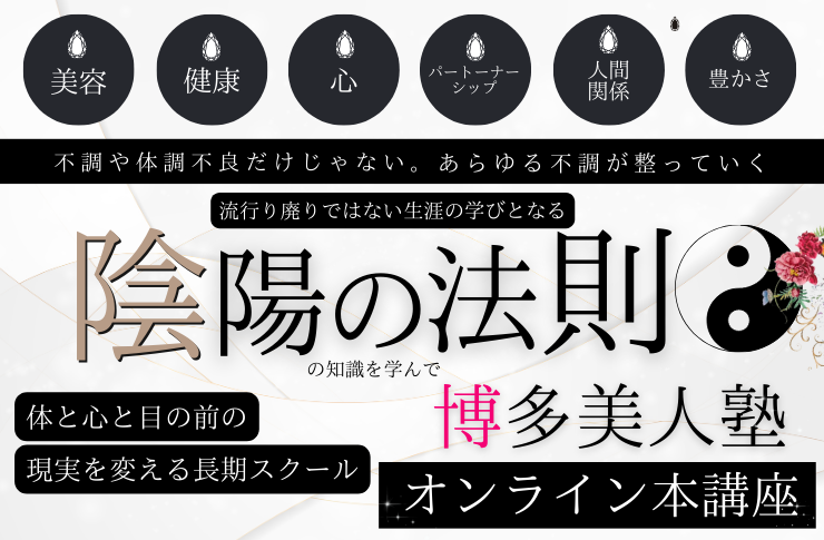 A.博多美人塾で目指す所は”自分で体と心の声を聞けるようになる””その対処法や整え方も自分で理解出来るようになる”という所です。でも、当然最初は「これは陰?これは陽?こういう時はどうする?今の私はどうしたらいいのだろう?」とわからなくなる事や迷う事があると思います。