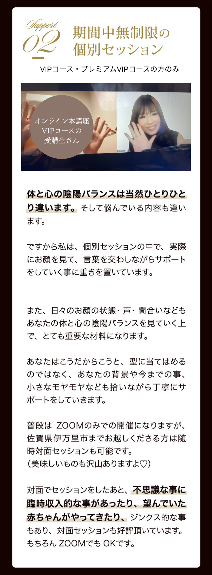 A.はい^^セッションがあるVIPコース・プレミアムVIPコースにお申し込みの場合は、私が直接マンツーマンで個別セッションを行います。