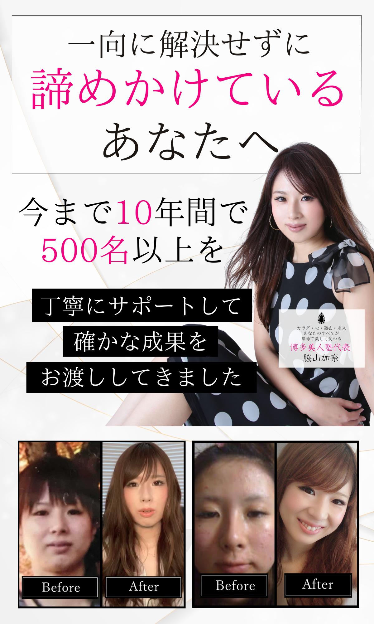 「悩みを終わらせる決断」「今の現状を変える真剣な決断」「自分の人生に対しての情熱」を持った博多美人塾が必要な人に受講してもらい、私も熱い想いを持って、同じベクトルのエネルギーでサポートしていきたいと思っています。そういったことからも、説明会に参加したからといって売り込まれることやしつこく勧誘することはありませんので、ご安心ください。