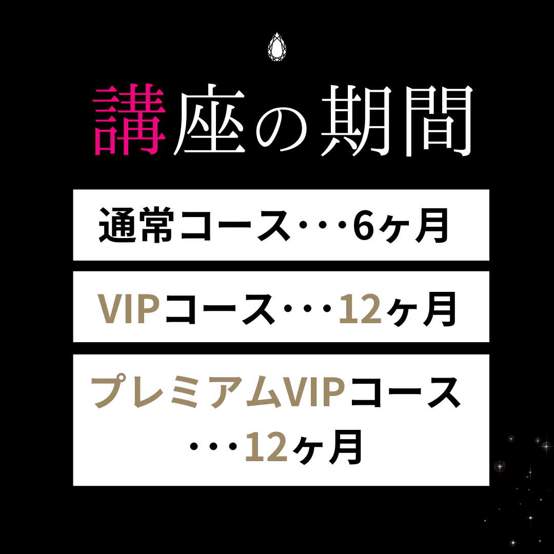 A.VIPコース・プレミアムVIPコースのグループ講義はコース期間中2回行っています。そのあとは随時の全体グループ講義にご参加頂けます^^グループ講義は受講生さんや講師陣の予定を調整しながら決めていきます。大体の時間帯は9時半か10時スタートで2時間前後を予定しています。